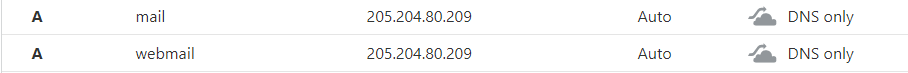 All with the same IP address that we got before, make sure the cloud is turned off if using cloudflare. (cpalendars and cpcontacts are optional and used only if you will synchronize calendars and contacts).